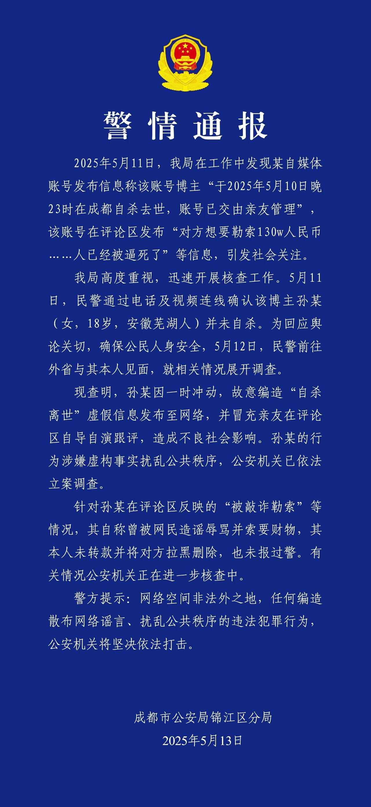 成都市公安局锦江区分局13日在其官方微信发布警情通报称,2025年5月11日,锦江区分局在工作中发现某自媒体账号发布信息称该账号博主“于2025年5月10日晚23时在成都自杀去世,账号已交由亲友管理”该账号在评论区发布“对方想要勒索130w人民币……人已经被逼死了”等信息,引发社会关注。