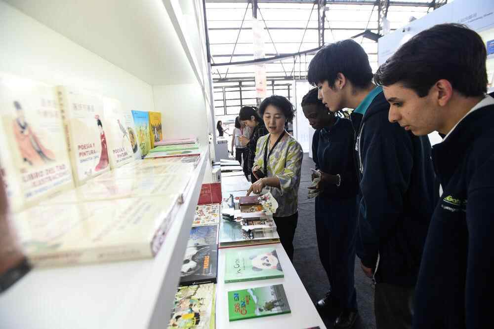 2024年11月8日,在智利圣地亚哥马波乔艺术文化中心内,当地民众在第43届智利圣地亚哥国际书展期间参观中国展区。新华社发(豪尔赫·比列加斯 摄)