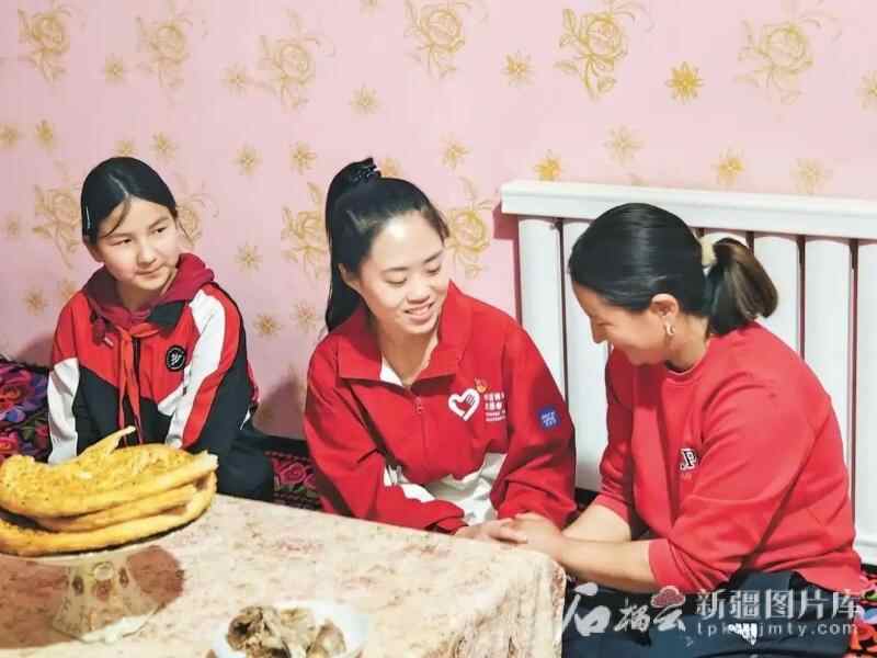 2023年8月以来,谢依特小学戍边支教西部计划志愿者服务队队员们开展家访2400多次。这是志愿者高淑贤(中)在家访(资料图)。谢依特小学供图