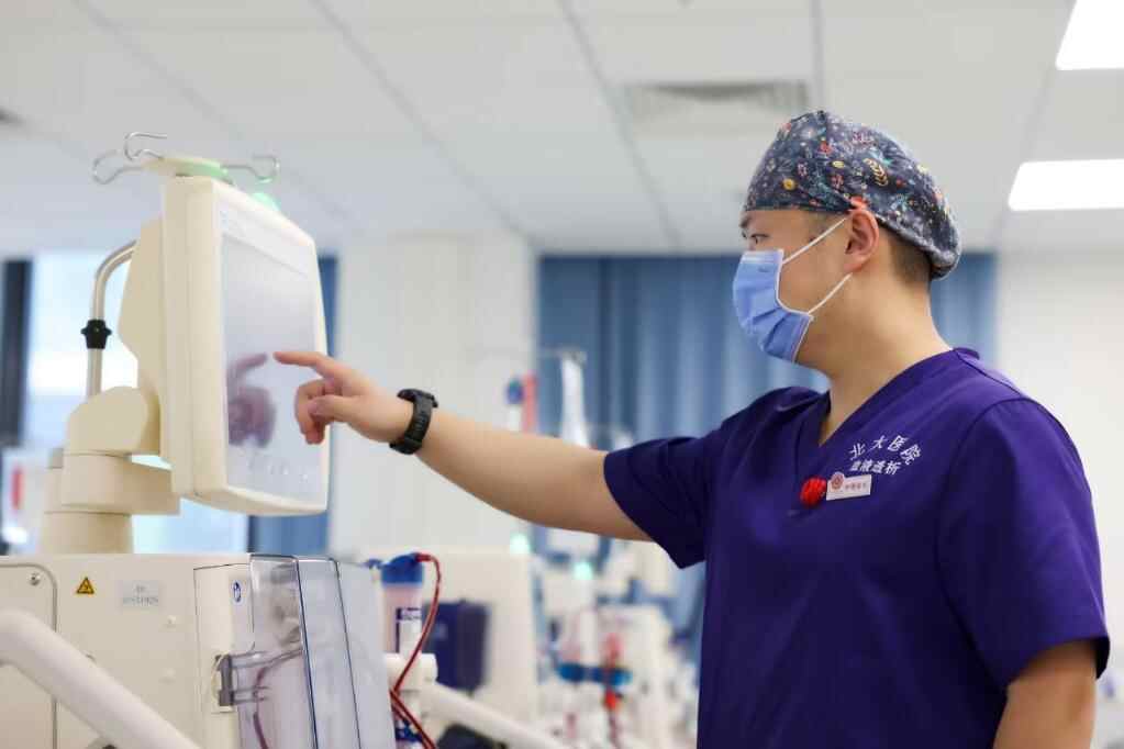 北京大学第一医院大兴院区血液透析中心护理组长隗怡正在操作设备。(北京大学第一医院供图)