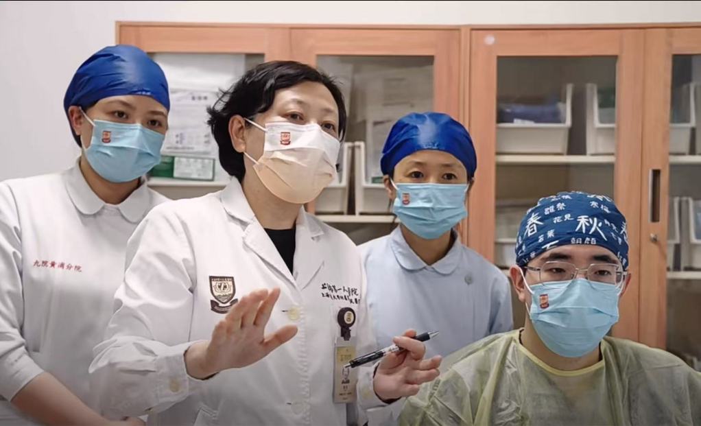 邢红(左二)指导年轻护士进行PICC置管操作。(上海市第一人民医院供图)
