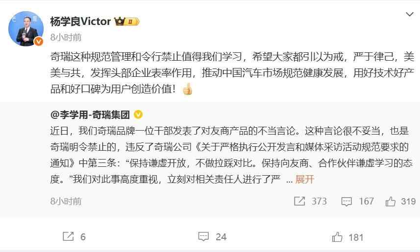 随后,吉利杨学良转发称:奇瑞这种规范管理和令行禁止值得我们学习,希望大家都引以为戒,严于律己,美美与共,发挥头部企业表率作用,推动中国汽车市场规范健康发展,用好技术好产品和好口碑为用户创造价值。