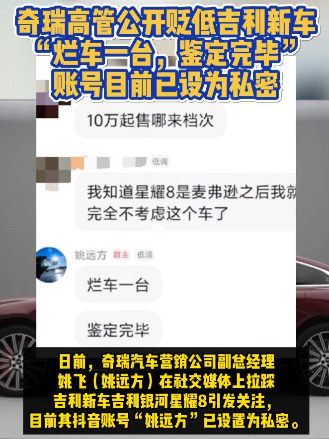 事情的起源是,近日,奇瑞汽车营销公司副总经理姚飞(社媒ID姚远方)在奇瑞风云“A9创始人版车主群”评价吉利银河星耀8时,采用了“烂车一台,鉴定完毕”“二排挤得很”“音响烂”等形容词,引发关注。