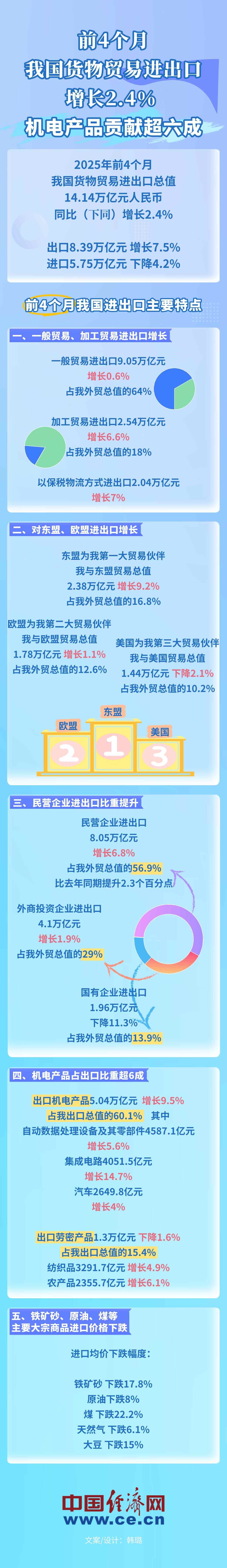 【图解】前4个月我国货物贸易进出口增长2.4% 机电产品贡献超六成