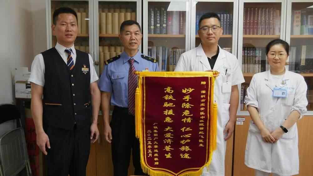 “我们单位号召全体职工学习您关键时刻挺身而出的担当精神。”5月12日下午,广铁集团广九客运段京广动四车队党支部书记伍辉利和列车长叶景亮来到深圳市宝安区中医院,向康复科中医师苗纪飞送上一面写着“妙手除危情,仁心护旅途,高铁驰援急,大爱济苍生”的锦旗。