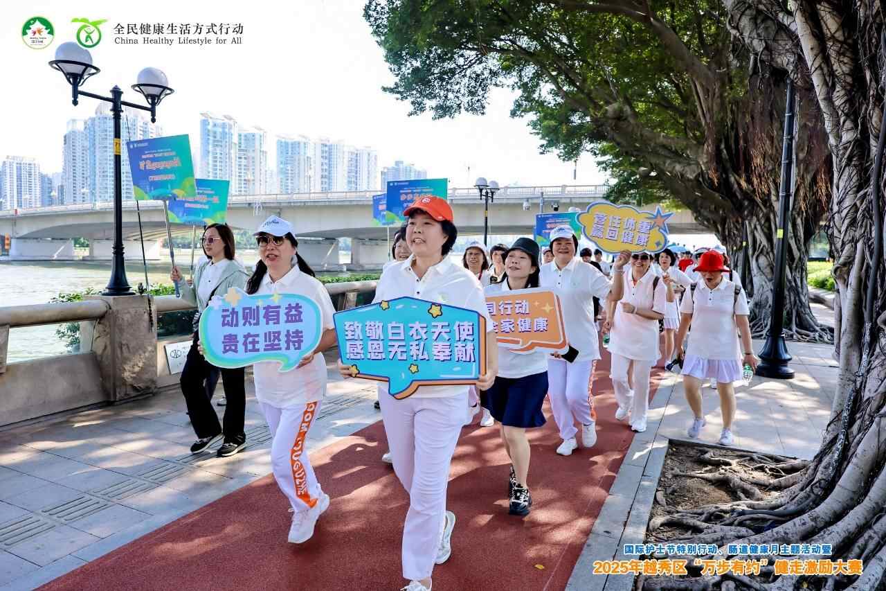 活动现场,领导嘉宾共同上台,正式启动2025年全国第十届“万步有约”健走激励大赛越秀赛区活动,专业健身教练带领全体参赛人员进行了热身运动,并示范了科学健走的正确姿势。由护士方队列队打头阵,开启珠江边步道路径健步走,从体育公园为起点,经过绿道缓跑径,到达海心桥脚。以一场别开生面的健步走活动向护士们致以最崇高的敬意。