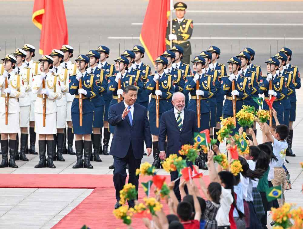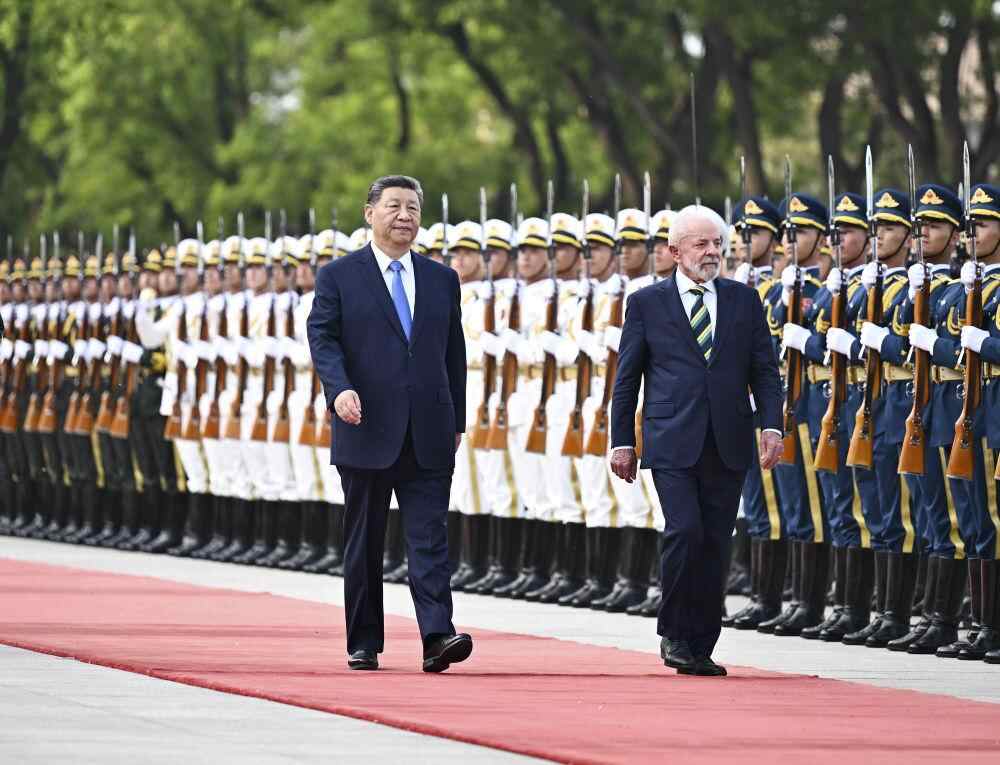 5月13日下午,国家主席习近平在北京人民大会堂同来华进行国事访问的巴西总统卢拉举行会谈。这是会谈前,习近平在人民大会堂东门外广场为卢拉举行欢迎仪式。新华社记者 饶爱民 摄