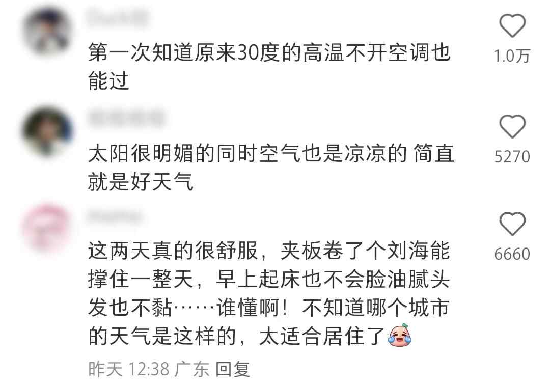 不少网友还表示,“不敢相信居然有30℃”“如同秋高气爽”“北方的初夏感”“求求了广东天气能不能一直这样”“难怪这两天心情都非常好”……