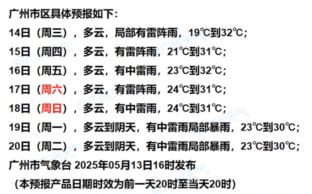根据广州市气象台5月13日发布的十天天气展望及市区七天预报,5月19日和20日,广州均为多云到阴天有中雷雨局部暴雨天气,且局部暴雨天气可能持续至21日。如果这一预报结论最终“成真”,广东2025年“龙舟水”天气存在着继续“多统计”的可能。