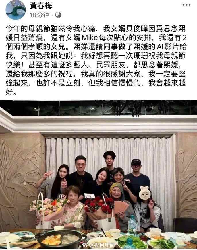 5月11日是母亲节。当晚,大S母亲黄春梅发文:今年的母亲节虽然令我心痛,我女婿具俊晔因为思念熙媛日益消瘦,还有女婿Mike每次贴心的安排,我还有2个孝顺的女儿。熙娣还请同事做了熙媛的AI影片给我,只因为我跟她说:我好想再听一次珊珊祝我母亲节快乐!甚至有这么多艺人、民众朋友,都思念着熙媛,还给我那么多的祝福,我真的很感谢大家,我一定要坚强起来,也许不是立刻,但我相信慢慢的,我会越来越好。