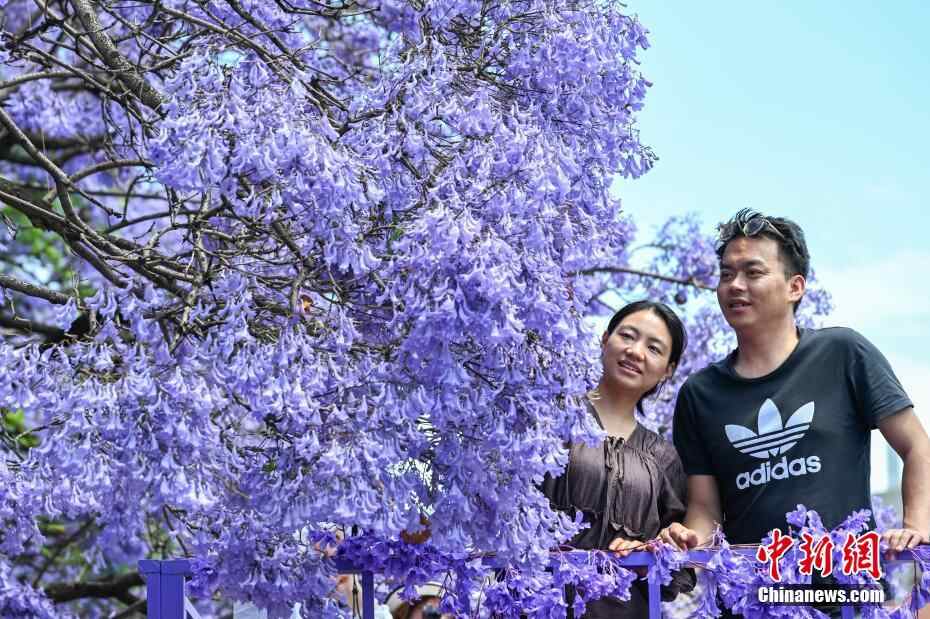 5月11日,游客在观景平台赏花。正值周末,云南省昆明市教场中路种植的蓝花楹迎盛花期,吸引众多市民和游客前来打卡拍照,共赴紫色花海之约。