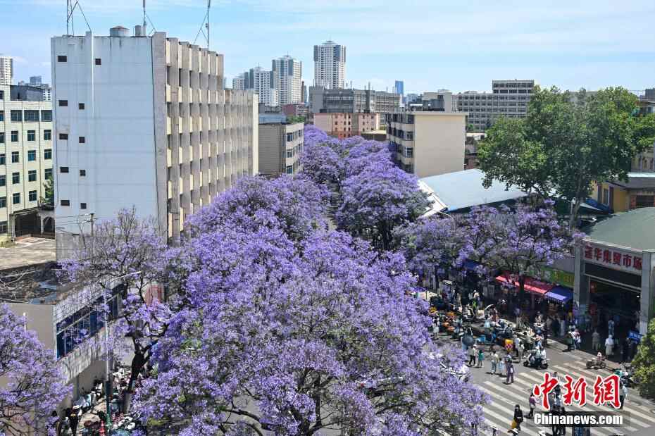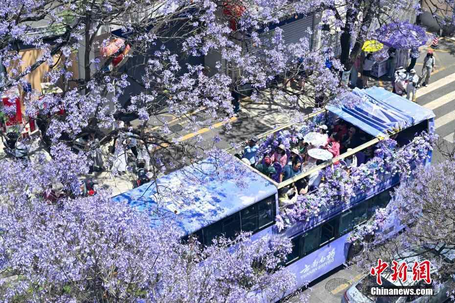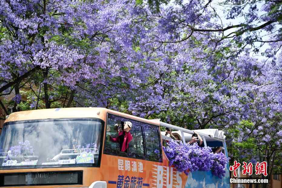 5月11日,一辆观光巴士在紫色花海中穿行。正值周末,云南省昆明市教场中路种植的蓝花楹迎盛花期,吸引众多市民和游客前来打卡拍照,共赴紫色花海之约。