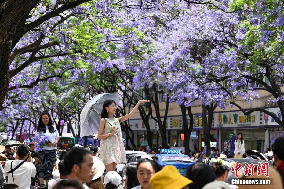 5月11日,游客在街头赏花拍照。正值周末,云南省昆明市教场中路种植的蓝花楹迎盛花期,吸引众多市民和游客前来打卡拍照,共赴紫色花海之约。