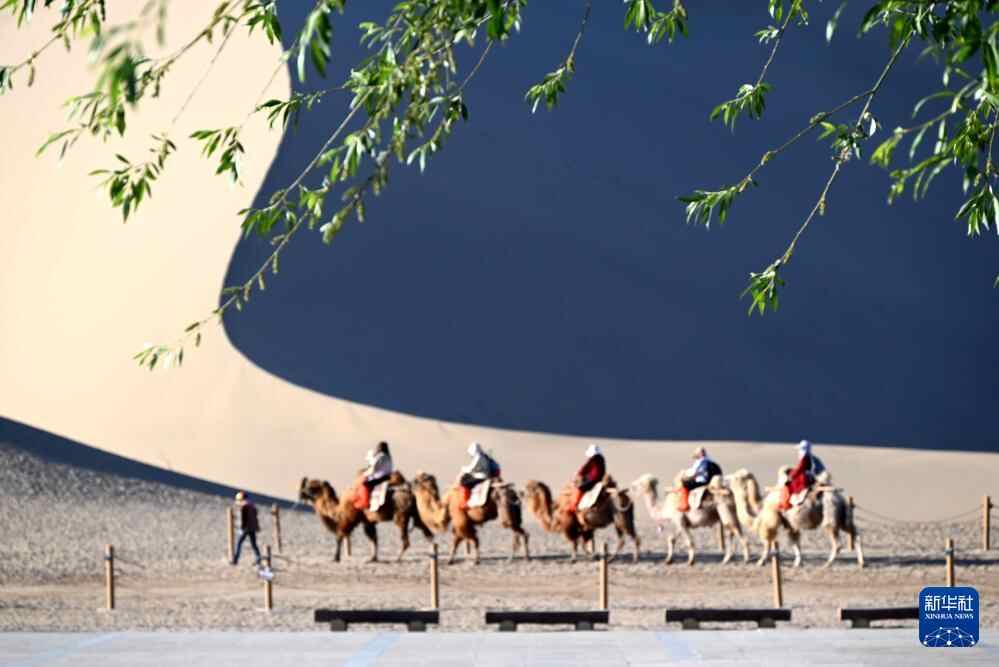 5月10日,游客在甘肃省敦煌市鸣沙山月牙泉景区游览。