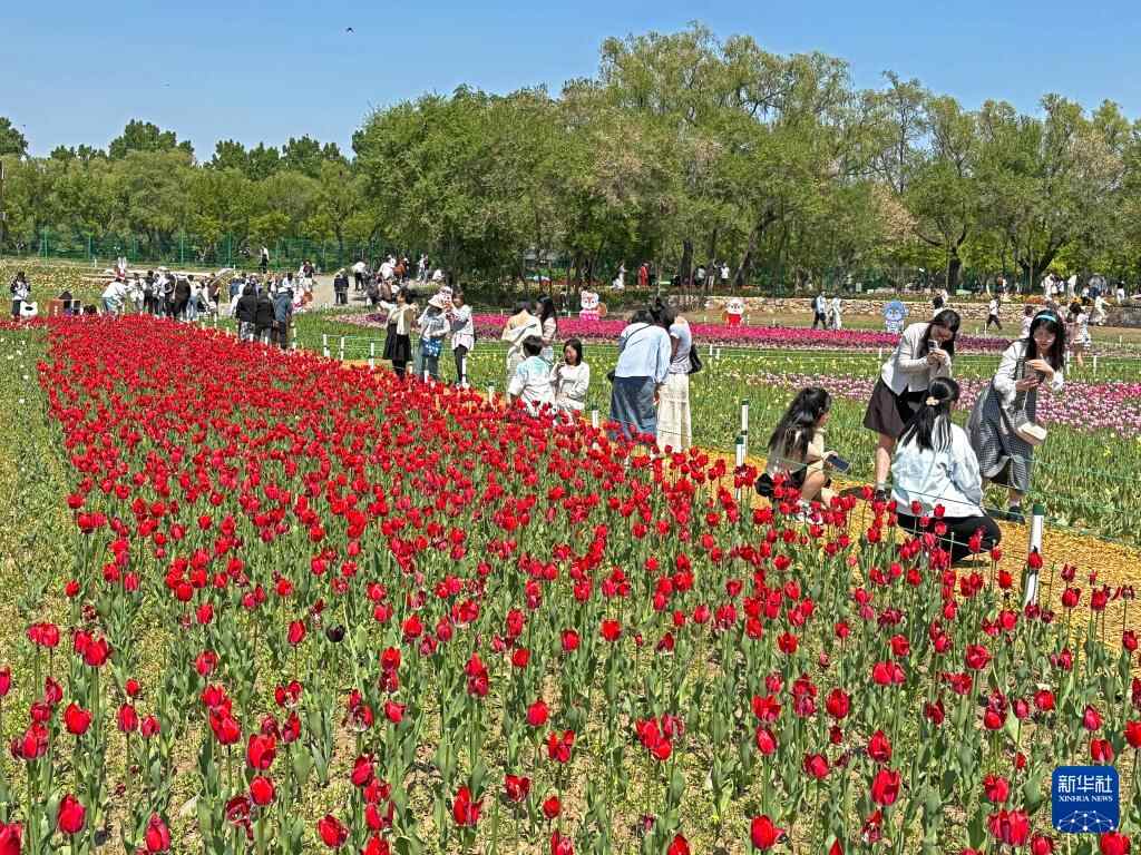 5月11日,游客在山东省枣庄市一景区内赏花休闲。