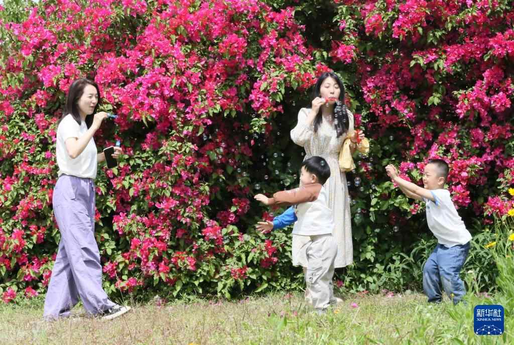 5月10日,在四川乐山三角梅花廊,家长带着孩子玩耍。