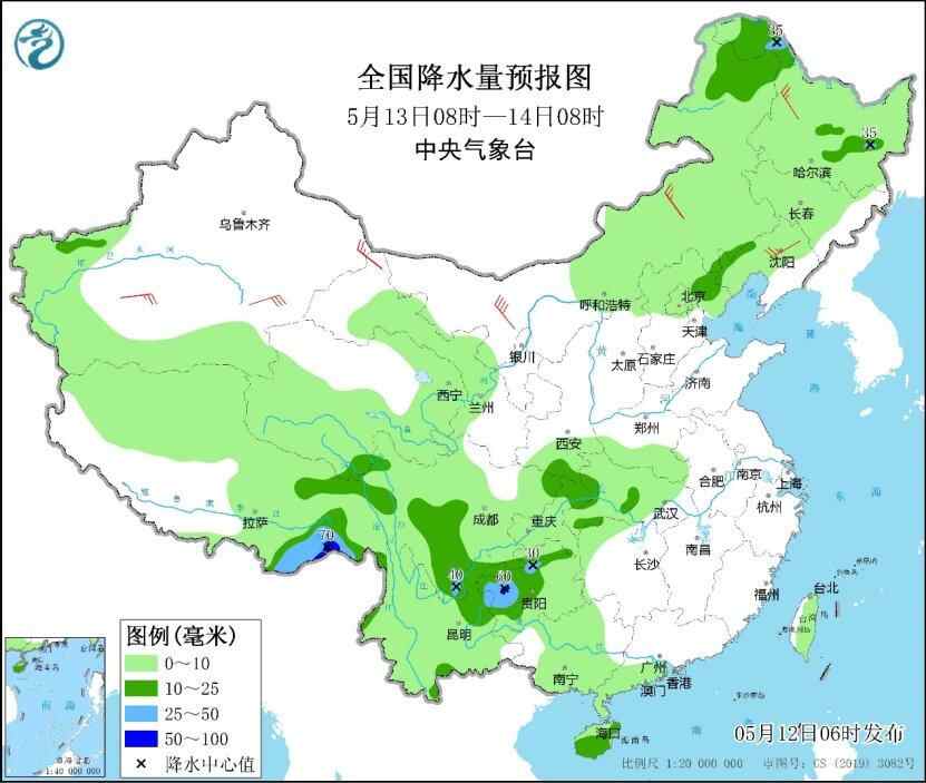 在降水方面,预计今天,全国大部地区仍降水较弱,仅西藏东部、四川北部、云南西部、陕西南部等地部分地区有中雨,局地大雨。明日起,南方地区雨水将增多,西南地区东部、江南中南部、华南中北部等地降水将呈现面弱点强、影响范围广等特点。此外,13日,内蒙古中东部、华北北部、东北地区有雷雨天气过程,局地风雹强对流