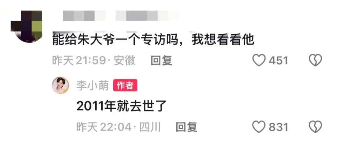 她称,很多人问自己和朱大爷还有联系吗,她表示,当年的朱大爷已于2011年去世。