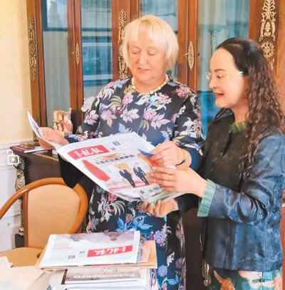 李双杰(右)向俄罗斯友人展示《龙报》。