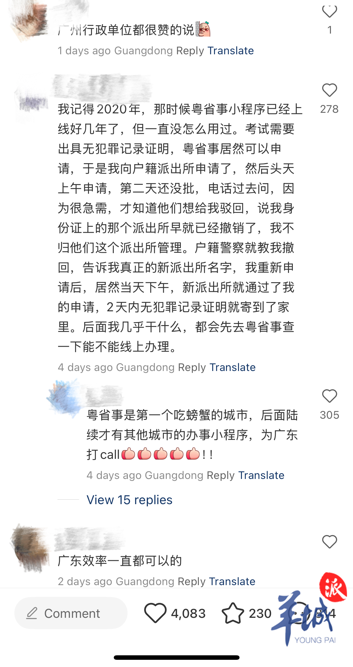 短短几天,小陈的帖子在社交平台获得四千多次点赞。许多网友与小陈有类似的感受,大家纷纷留言:广州政务服务效率高、人性化,给广州速度狠狠点赞,广州政务单位办事真的特别稳妥,等等。此外,还有不少网友分享自己在广州办证的良好体验,评论区瞬间变成大型夸夸现场。目前,该条帖子的点赞数、评论数还在增加。