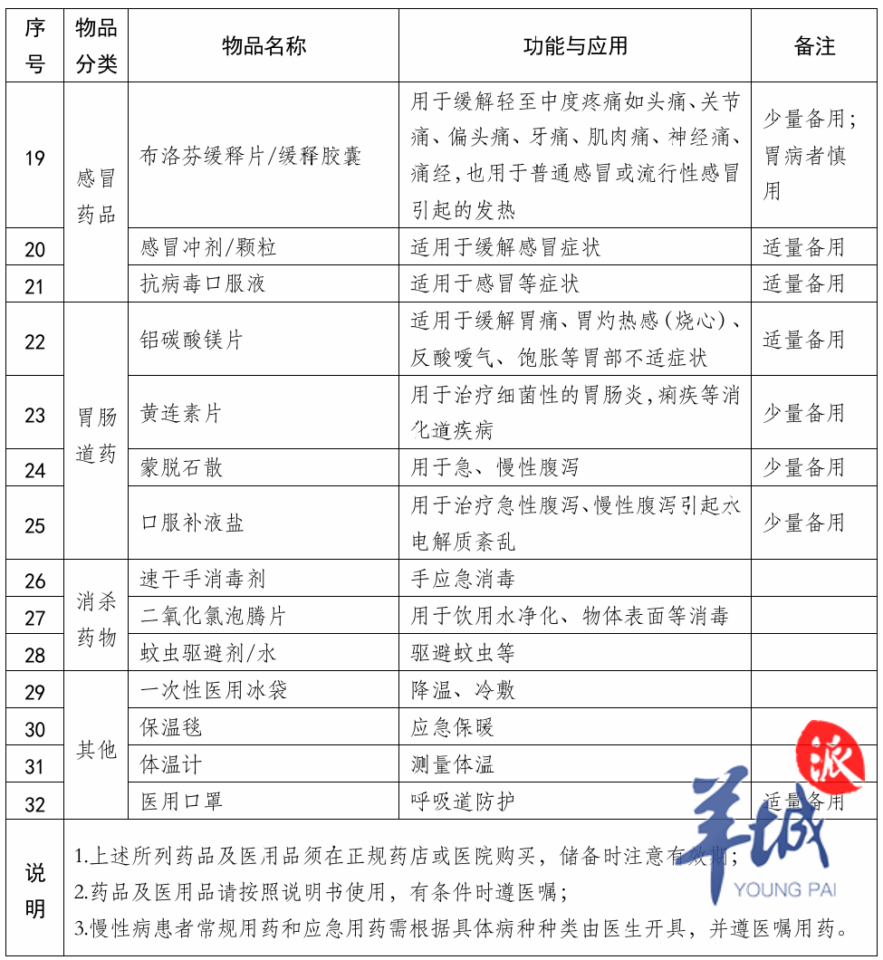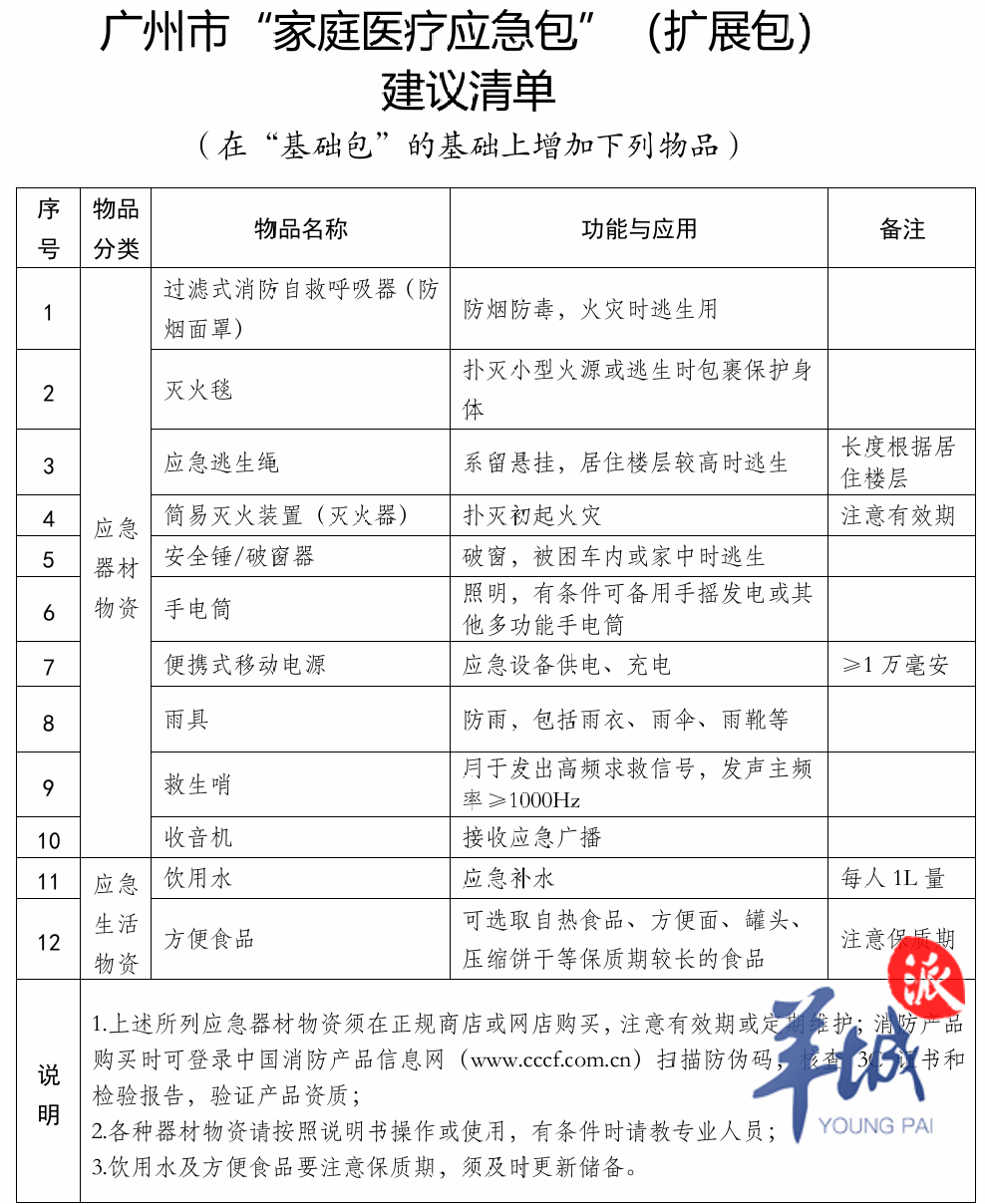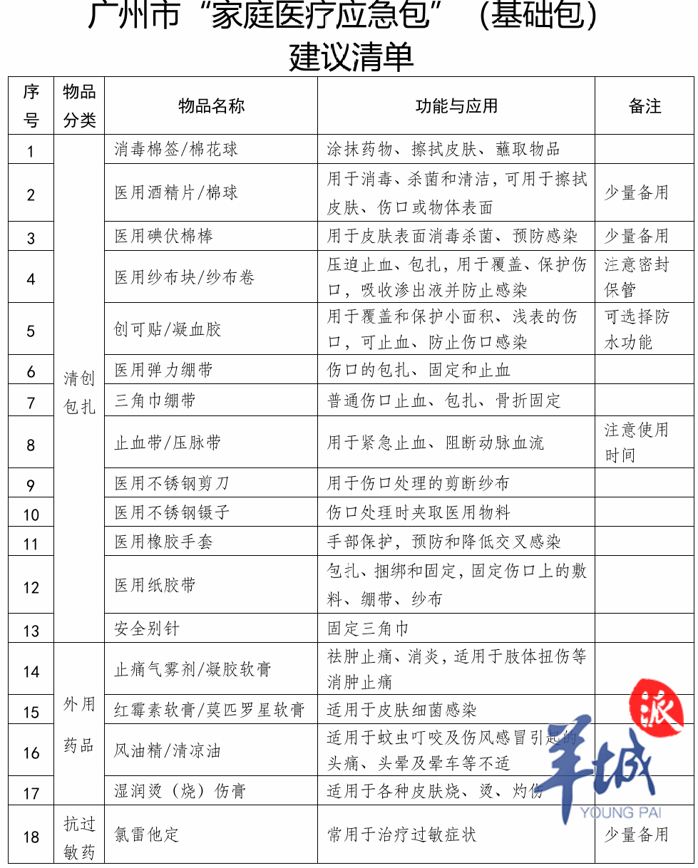 为加强家庭应对突发事件卫生应急能力,广州市卫生健康委员会、广州市应急管理局、广州市消防救援支队组织医疗、应急、消防等领域专家制定了《广州市“家庭医疗应急包”建议清单》。