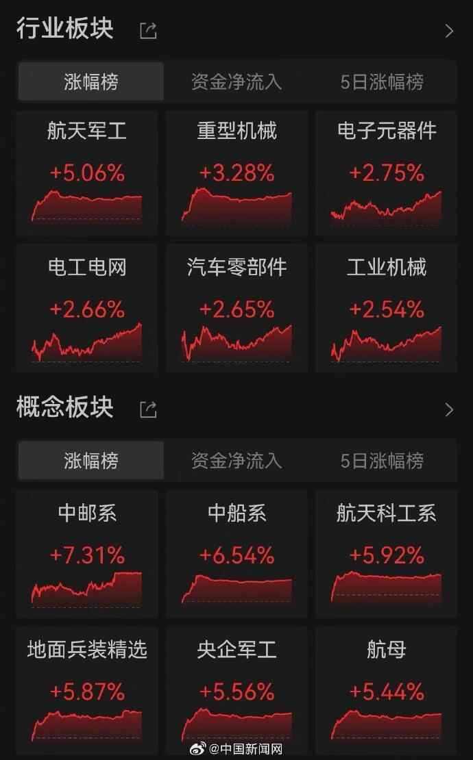 全市场超4100只个股上涨,总成交额超1.3万亿元,较前一个交易日有所放量。行业板块方面,航天军工板块领涨,中航成飞、晨曦航空、航天南湖、雷科防务、光电股份、国睿科技等相关个股涨停;重型机械、电子元器件、电工电网等板块涨幅居前。