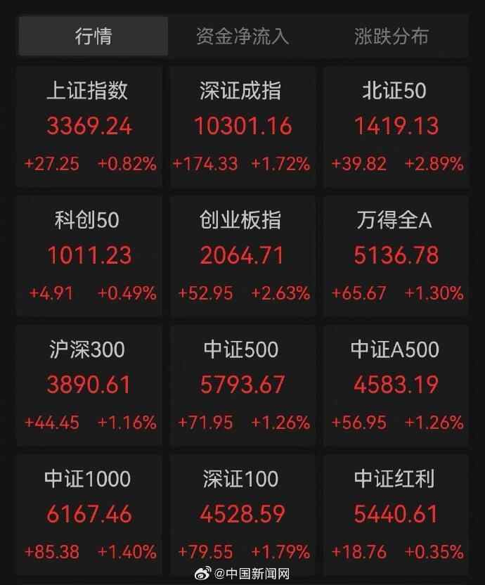 5月12日,A股主要股指集体收涨,截至收盘,沪指涨0.82%报3369.24点;深成指涨1.72%报10301.16点;创业板指涨2.63%报2064.71点;北证50指数涨2.89%报1419.13点。