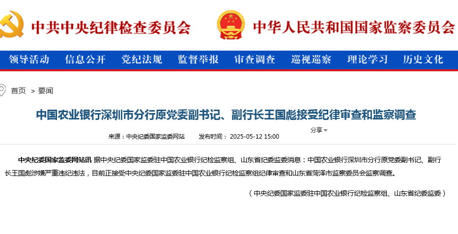 5月12日,据中央纪委国家监委网站消息,中国农业银行深圳市分行原党委副书记、副行长王国彪涉嫌严重违纪违法,目前正接受中央纪委国家监委驻中国农业银行纪检监察组纪律审查和山东省菏泽市监察委员会监察调查。