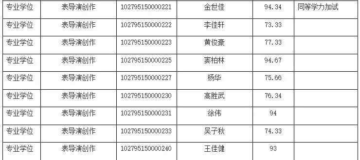 名单显示金世佳报考的是表导演创作专业学位,业务一科目成绩为94.34分,黄晓明报考的则是艺术管理/戏剧策划的专业学位,业务一科目成绩为89分。