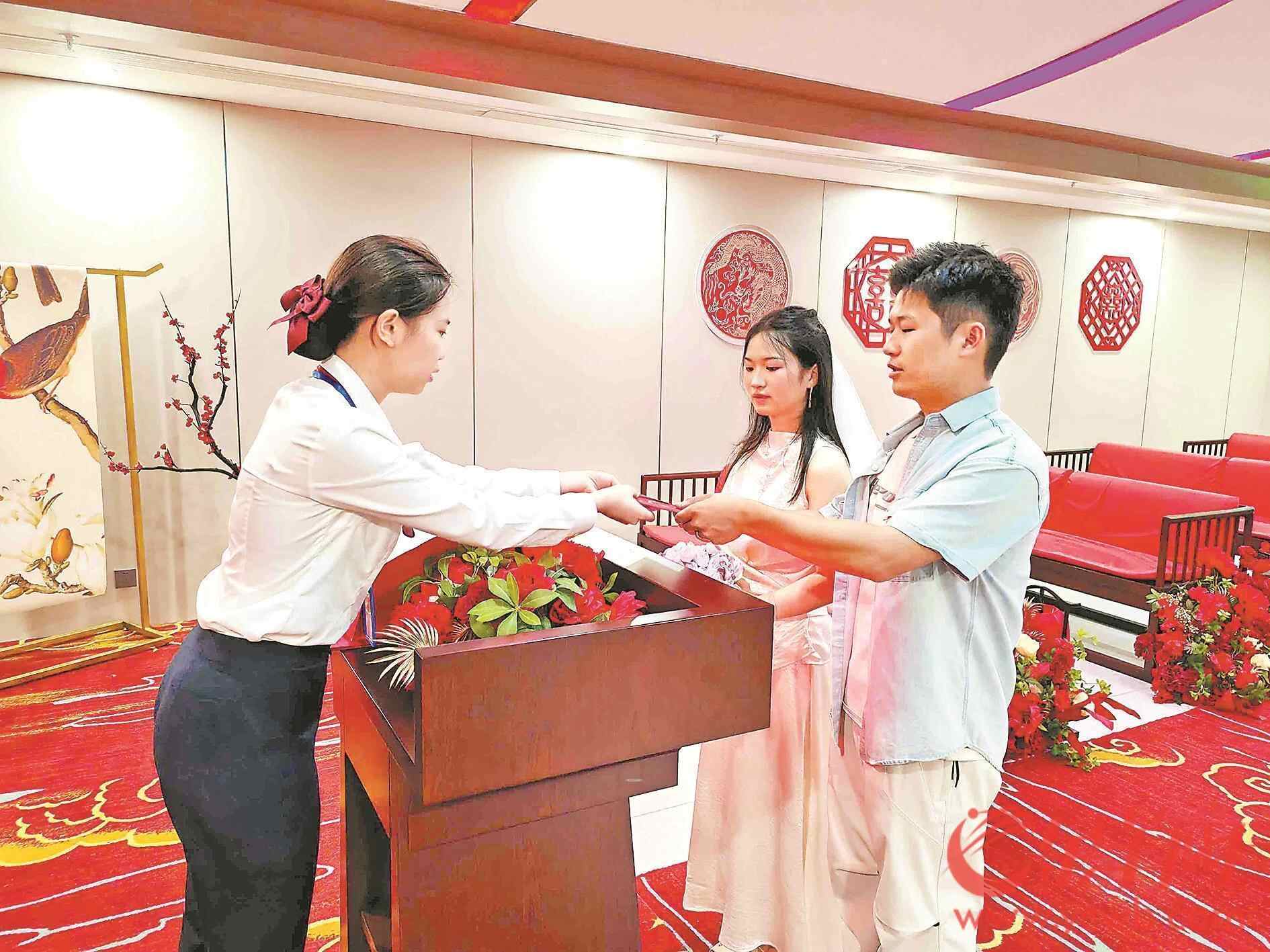 羊城晚报讯 记者高焓,通讯员张萌、叶金鑫报道:“可以在我们相识相恋、共同打拼的广州领证,非常有纪念意义。”昨日,安徽人周女士和黑龙江人徐先生带上身份证,在广州喜结连理。