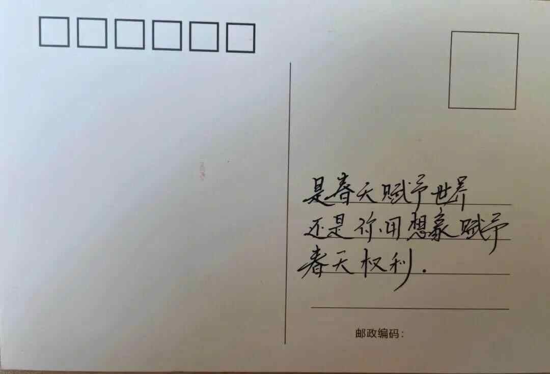 校园里的同学们在“翁城孩子的诗”的明信片背后给翁城孩子们留言,在《春天分颜色》明信片背后写着:“是春天赋予世界,还是你用想象赋予春天权利。”一首首诗的背后是交流,是祝愿:“春风徐来,我在北大等你。”“那这个地方一定很有诗意,很美丽,这大山,这景色,太漂亮了!”“随便怎么想,兔子和萝卜不该总是原来的模样,你的想象应该飞翔!”