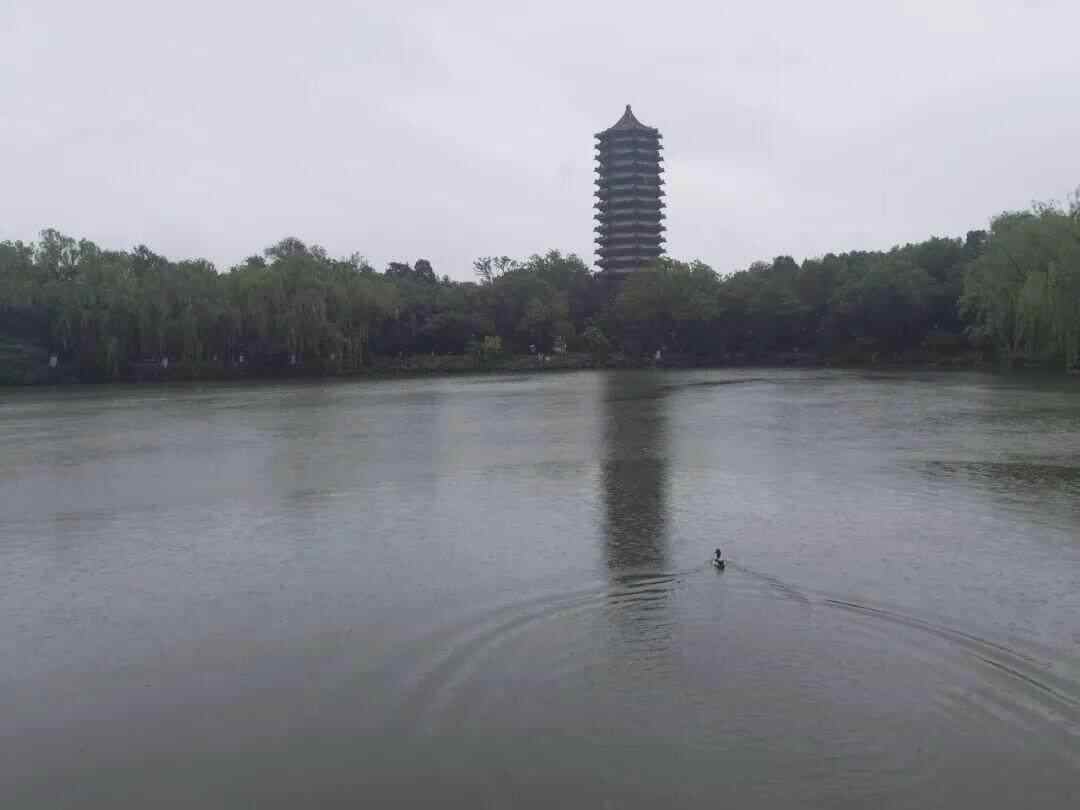 中午,户外访北大胜迹。在未名湖转了很久。博雅塔挺拔又秀丽。雨中登石舫,眺望层楼,忽见历史烟云升腾。