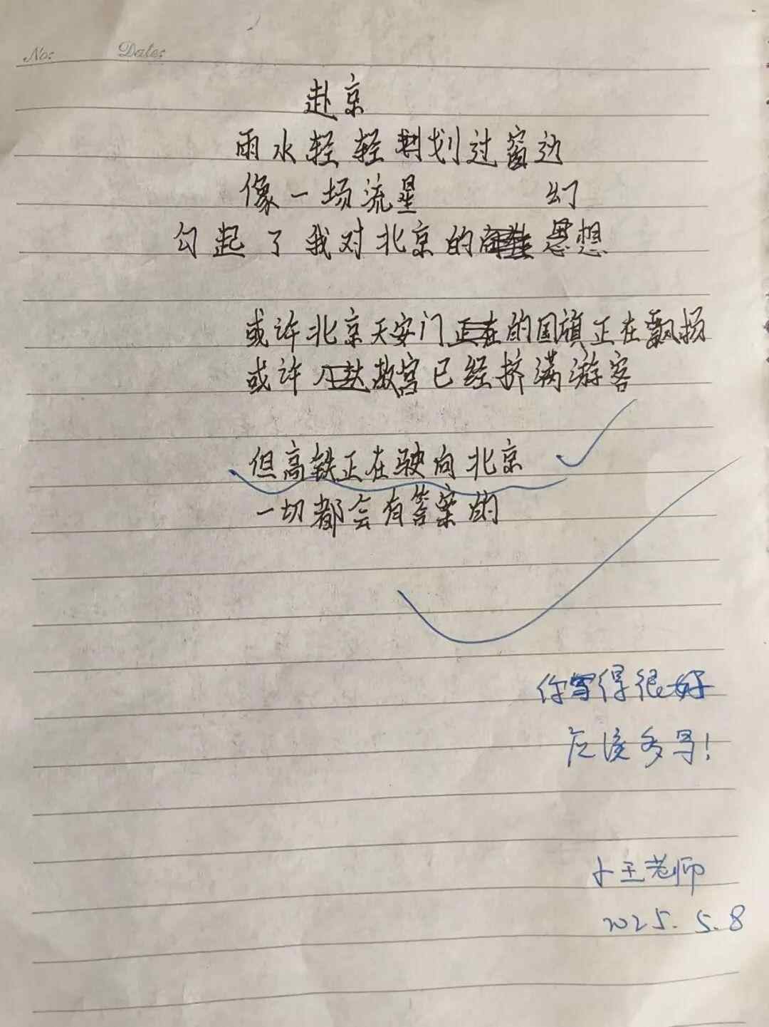 5月8日,翁城小诗人们踏上复兴号列车,带着翁城孩子的诗前往北京。从南到北,窗外的景色不断变换,从起起伏伏的山地丘陵到辽远广阔的平原,历时将近10个小时,终于抵达了北京。