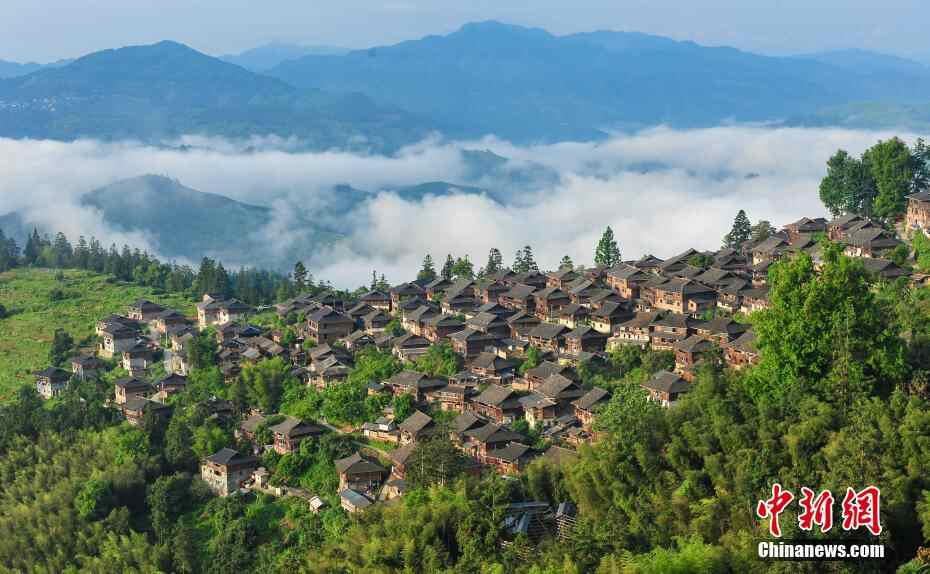5月10日,在贵州省黔东南苗族侗族自治州从江县丙妹镇拍摄的岜沙苗寨风光。初夏时节,岜沙苗寨绿意盎然,苗族吊脚楼鳞次栉比,缥缈如烟的云海与古朴村落、葱郁青山相映成趣,勾勒出如诗如画的田园风光。
