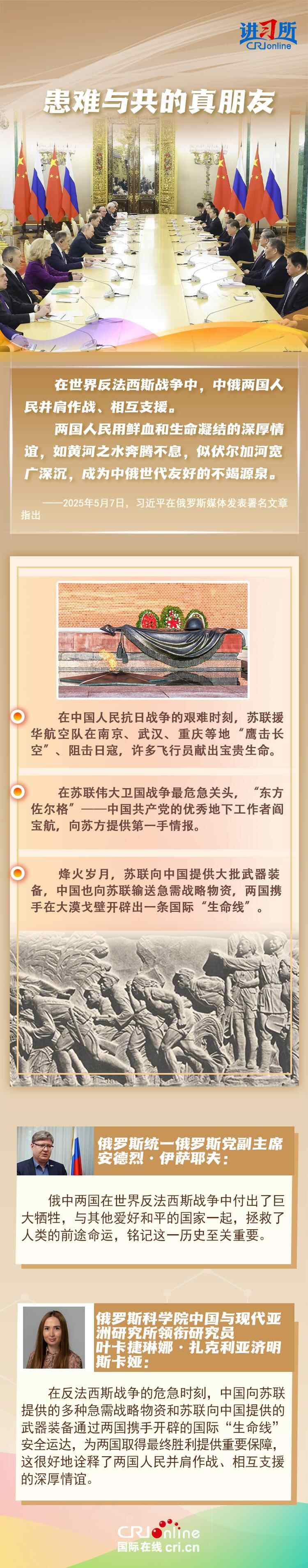 “两国人民用鲜血和生命凝结的深厚情谊,如黄河之水奔腾不息,似伏尔加河宽广深沉,成为中俄世代友好的不竭源泉。”今年是中国人民抗日战争、苏联伟大卫国战争暨世界反法西斯战争胜利80周年,也是联合国成立80周年。在这一重要历史时间节点,习近平主席此访不仅为中俄关系发展注入强劲动力,也向世界宣示中俄两国携手捍卫二战胜利成果的坚定意志。