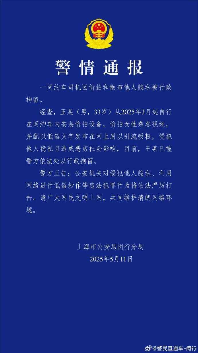 一网约车司机因偷拍和散布他人隐私被行政拘留。经查,王某(男,33岁)从2025年3月起自行在网约车内安装偷拍设备,偷拍女性乘客视频,并配以低俗文字发布在网上用以引流吸粉,侵犯他人稳私且造成恶劣社会影响。目前,王某已被警方依法处以行政拘留。