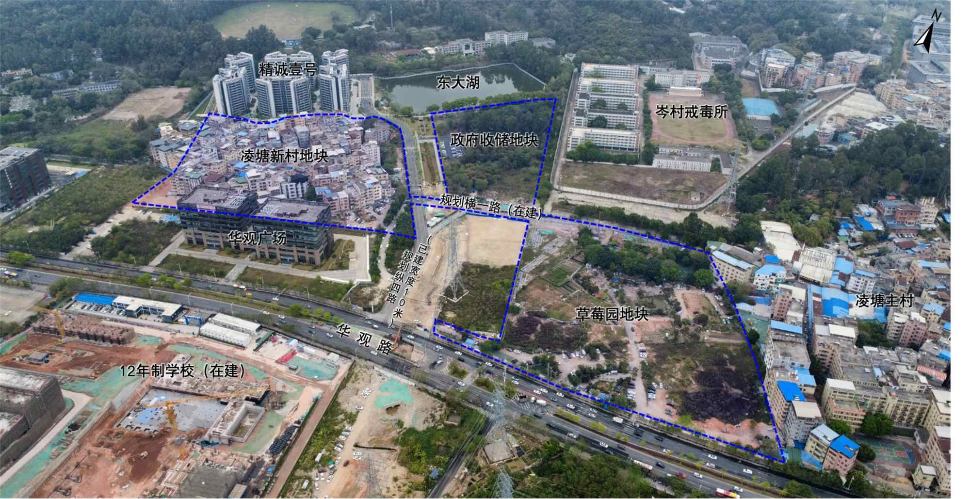 本次《规划》调整范围为凌塘村改造项目首期范围,用地面积11.11公顷,包括凌塘新村、草莓园地块和政府储备地。目前,该地块东侧无现状建筑,西侧为凌塘新村村民自建房,现状建设量13.63平方米。