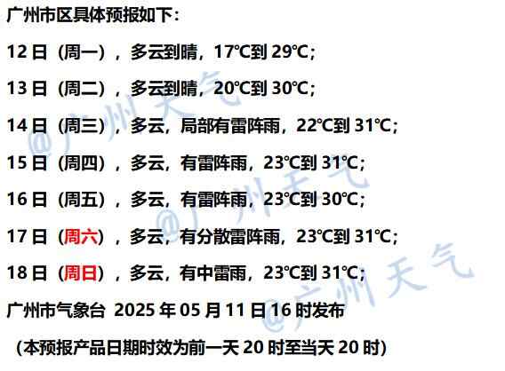 广州方面,本周天气节奏感很强,周一周二天气晴好,适合洗衣晾晒,但昼夜温差大,可以随身带件薄外套,中午升温后脱掉。周三起雷雨渐趋频繁,户外出行要小心,随身带伞不能忘哦。