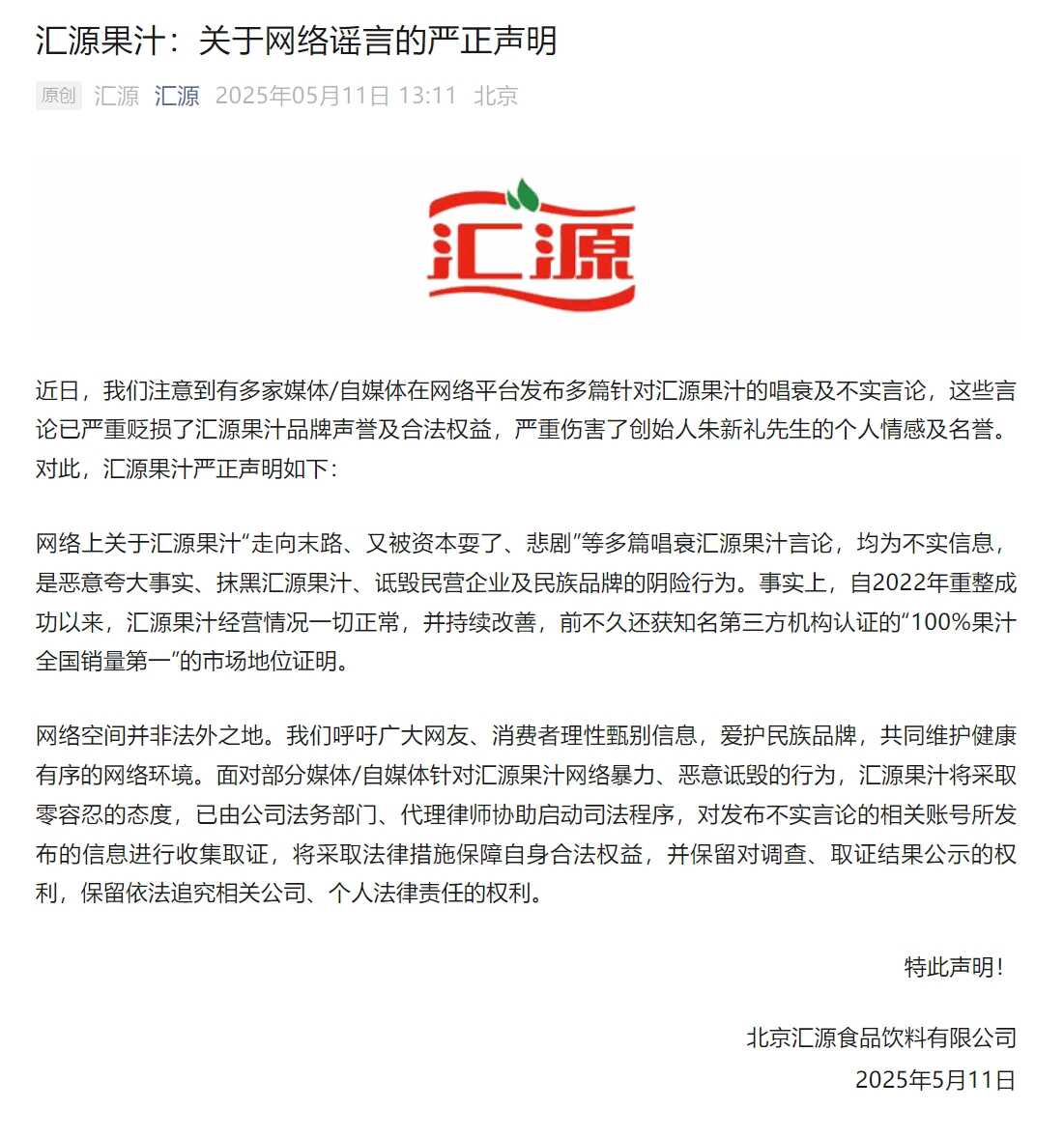 5月11日,汇源果汁发布关于网络谣言的严正声明,以下为全文——