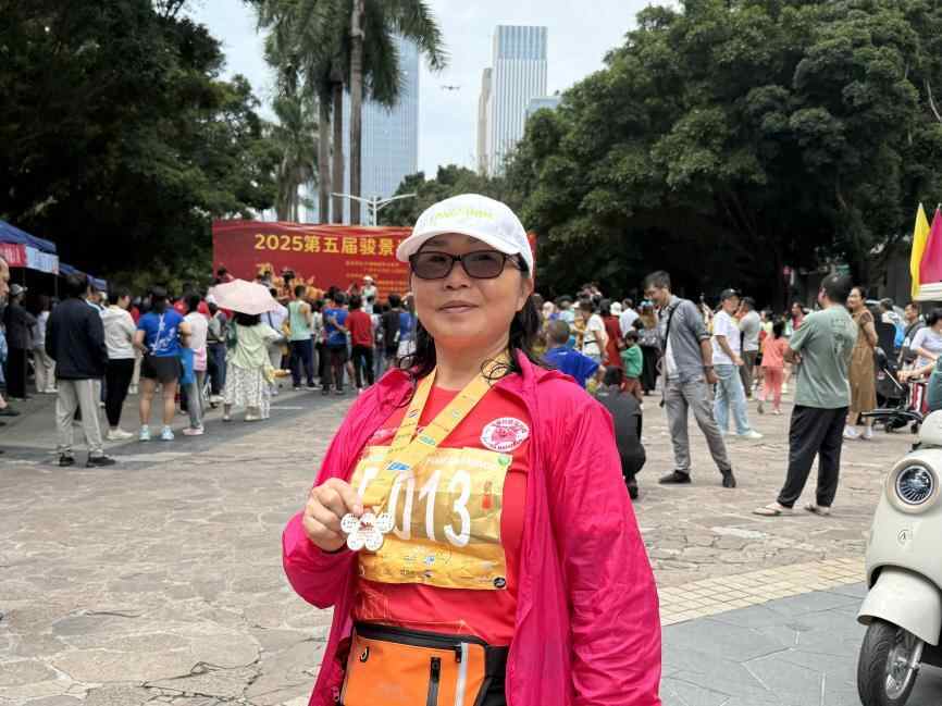 已经参与五次骏景半程马拉松的陈姐在健康跑的10公里完赛后,又跟着半马的选手跑了8公里。她坦言,自己开始跑步半年后就成功减重20斤。在加入骏景马帮以后,每天在团队激励的氛围下坚持跑步,一跑就是八年。