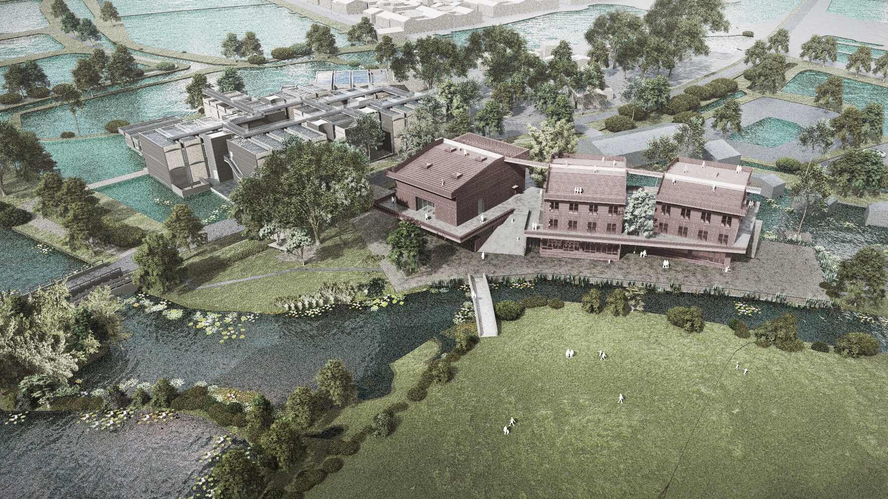 夏雨阵阵,沾带雨珠的荷叶相互依偎,微风吹拂下摩挲有声。站在春阳台屋顶朝西南方望去,空中的荷花池与村落里的水域遥相呼应,成为高低错落的“立体荷塘”。“春阳台的建设占用了村头原来的荷塘,我们应该把这片水面归还给塱头,所以就在屋顶上种植了荷花。”张永和作如此解说。