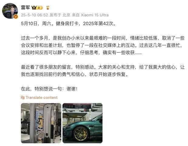 5月10日早间,小米创办人、董事长兼CEO雷军在微博发文称,“过去一个多月,是我创办小米以来最艰难的一段时间,情绪比较低落,取消了一些会议安排和出差计划,也暂停了一段在社交媒体上的互动。过去这几年一直很忙,这段时间反而可以静下心来,仔细思考,确实有一些收获……最近看了很多朋友的留言,特别感动。大家的关心和支持,给了我莫大的信心,让我也逐渐找回前行的勇气和信心,状态开始逐步恢复。”