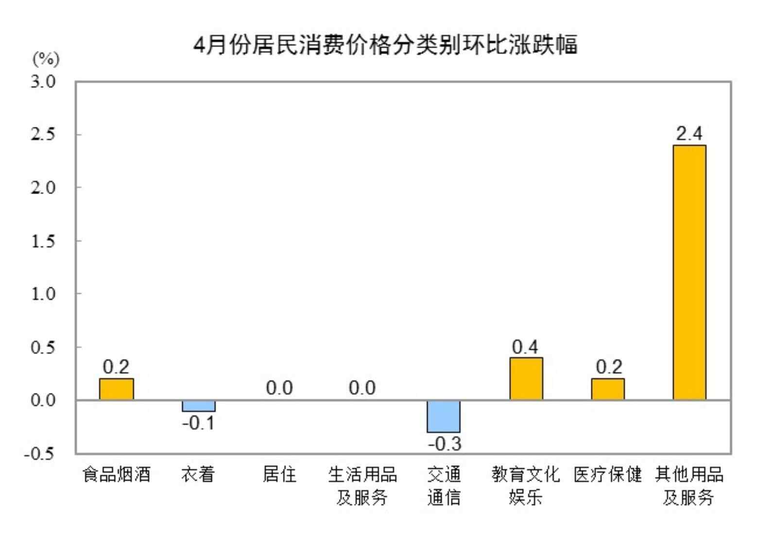 4月份,全国居民消费价格环比上涨0.1%。其中,城市上涨0.2%,农村持平;食品价格上涨0.2%,非食品价格上涨0.1%;消费品价格持平,服务价格上涨0.3%。