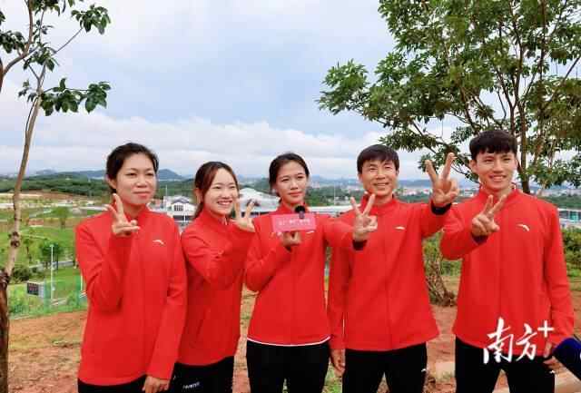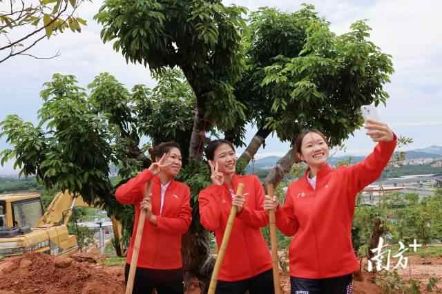 “十五运会双金到手,荔枝美味必须有。‘520’相约茂名高州,吃荔枝、游千年荔乡!”植树活动结束后,五名队员在树下合影留念,共同为茂名荔枝点赞。