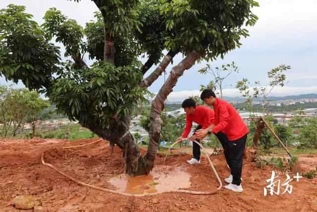 队员们给荔枝树浇水。