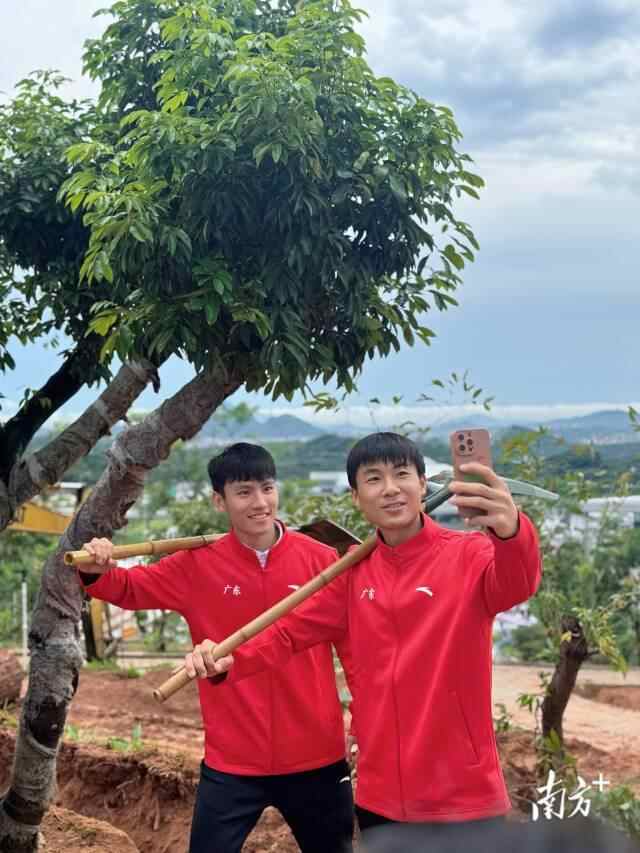 广东男队队员唐潇(左)、李卓业(右)与亲手植下的白糖罂荔枝树合影留念。