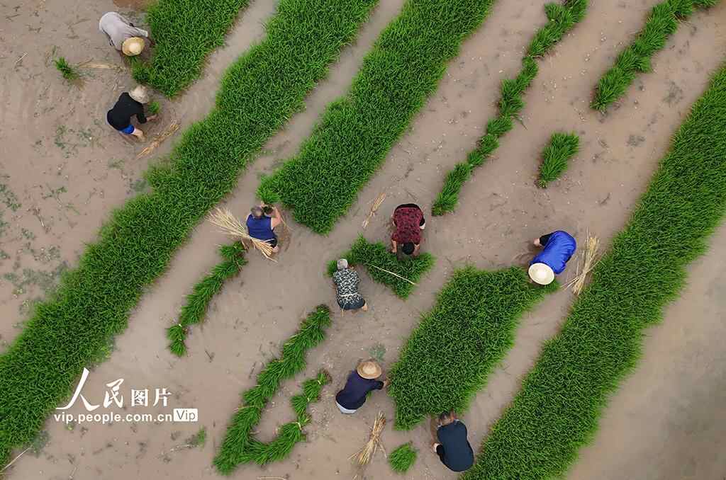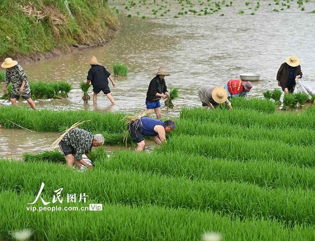 2025年5月9日,在四川省南充市蓬安县金溪镇马家桥村,农民正在起秧。周亮摄(人民图片网)