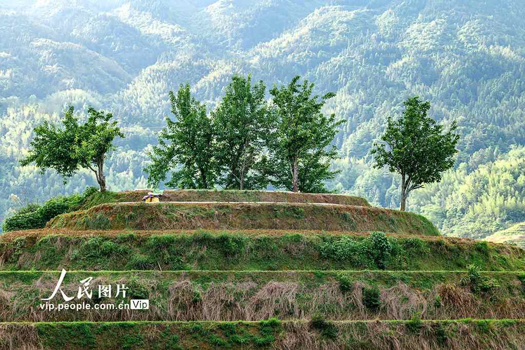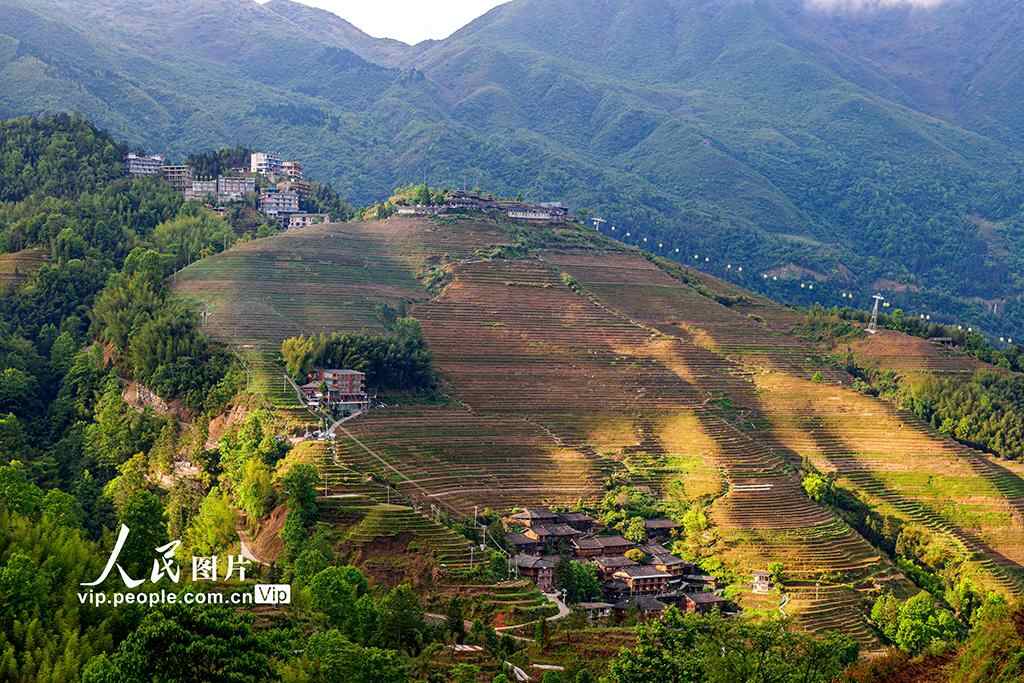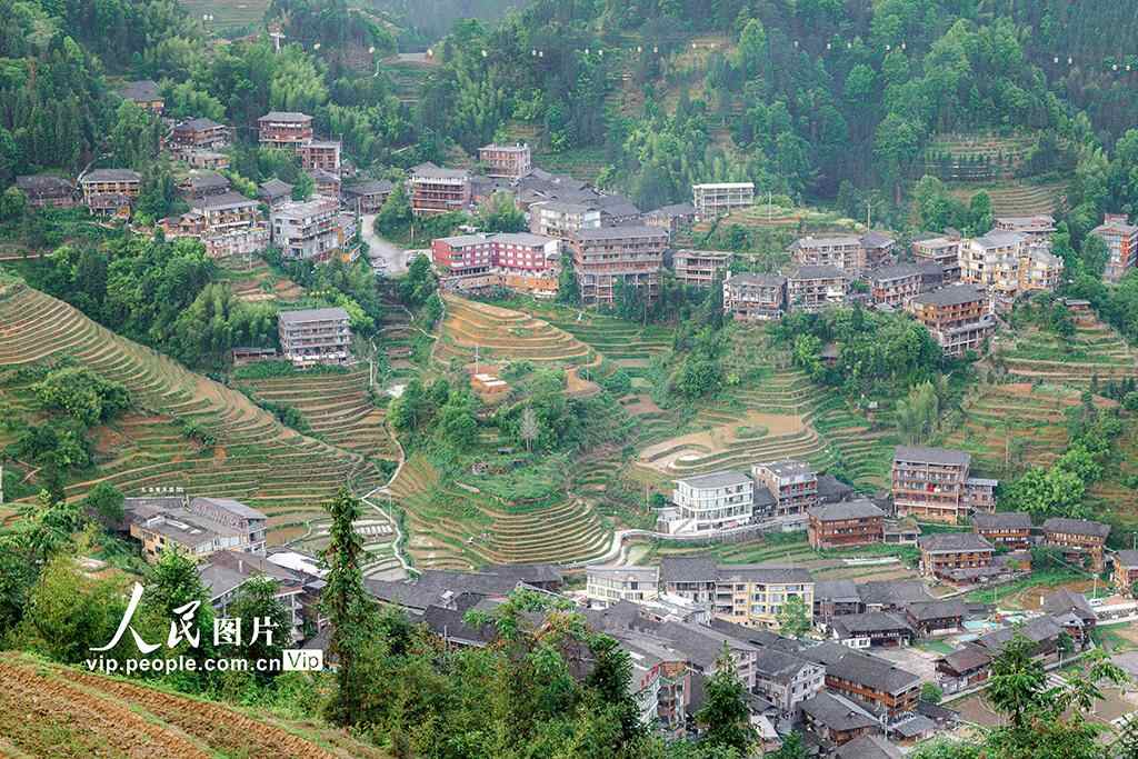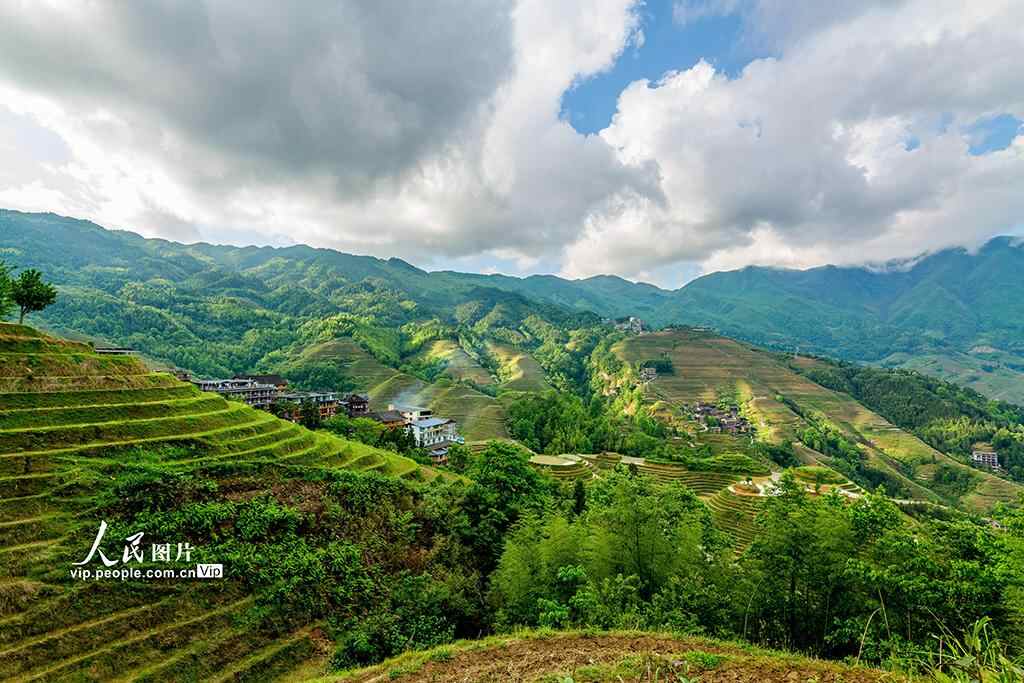 2025年5月9日,广西桂林市龙胜各族自治县龙脊梯田进入春耕备耕时期,梯田蓄水丰盈、线条分明,层层叠叠的梯田与当地吊脚楼相互映衬,构成一幅和谐自然的田园画卷。黄泰茗摄(人民图片网)