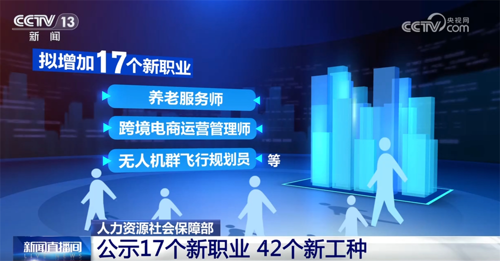 央视网消息:人力资源社会保障部日前公示第七批新职业、新工种。其中,拟增加17个新职业,包含养老服务师、跨境电商运营管理师、无人机群飞行规划员等。拟增加42个新工种,包含生成式人工智能系统测试员、智慧景区管理师等。