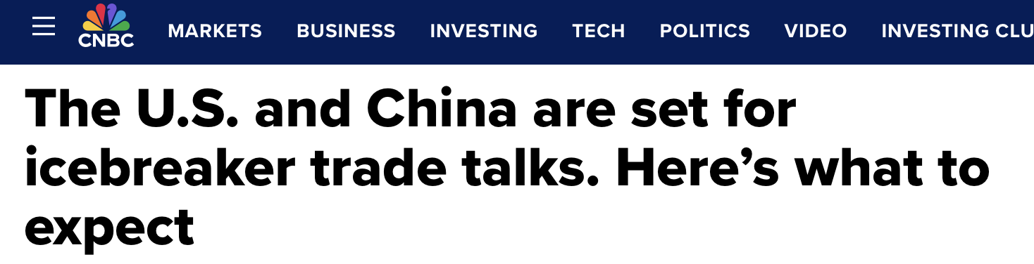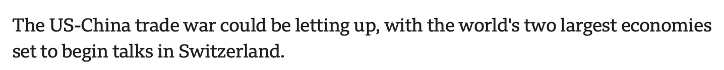 英国广播公司的报道称,随着世界两大经济体即将在瑞士开始会谈,中美贸易战可能正在缓和。